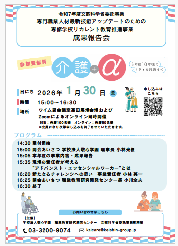 この度、社会福祉法人善光会(所在地:東京都大田区東糀谷6-4-17/TEL:03-5735-8080/理事長:西田 日出美、以下「善光会」)は、令和7年度文部科学省委託研究事業「専門職業人材最新技能アップデートのための専修学校リカレント教育(リ・スキリング)推進事業」(学校法人敬心学園 職業教育研究開発センターが採択)について、下記のとおり成果報告会が開催されることをお知らせいたします。